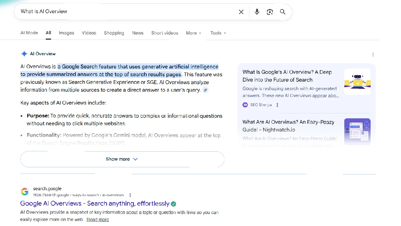 AI Overviews don’t appear on every search. They show up for certain types of queries where an AI-generated answer adds value. When they do appear, they fundamentally change how users interact with search results and how websites get visibility.